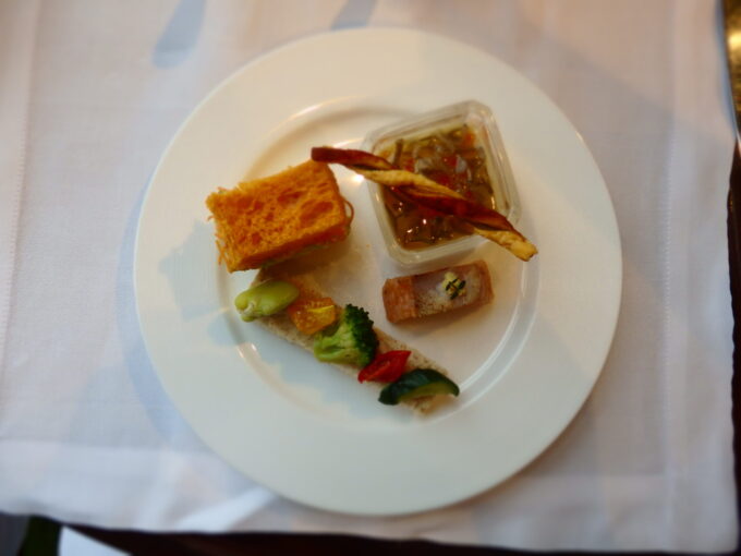 ・全粒粉パンクルトン パルマ産生ハムとサワークリームディップ 彩り野菜茄子とトマトとパルミジャーノ
